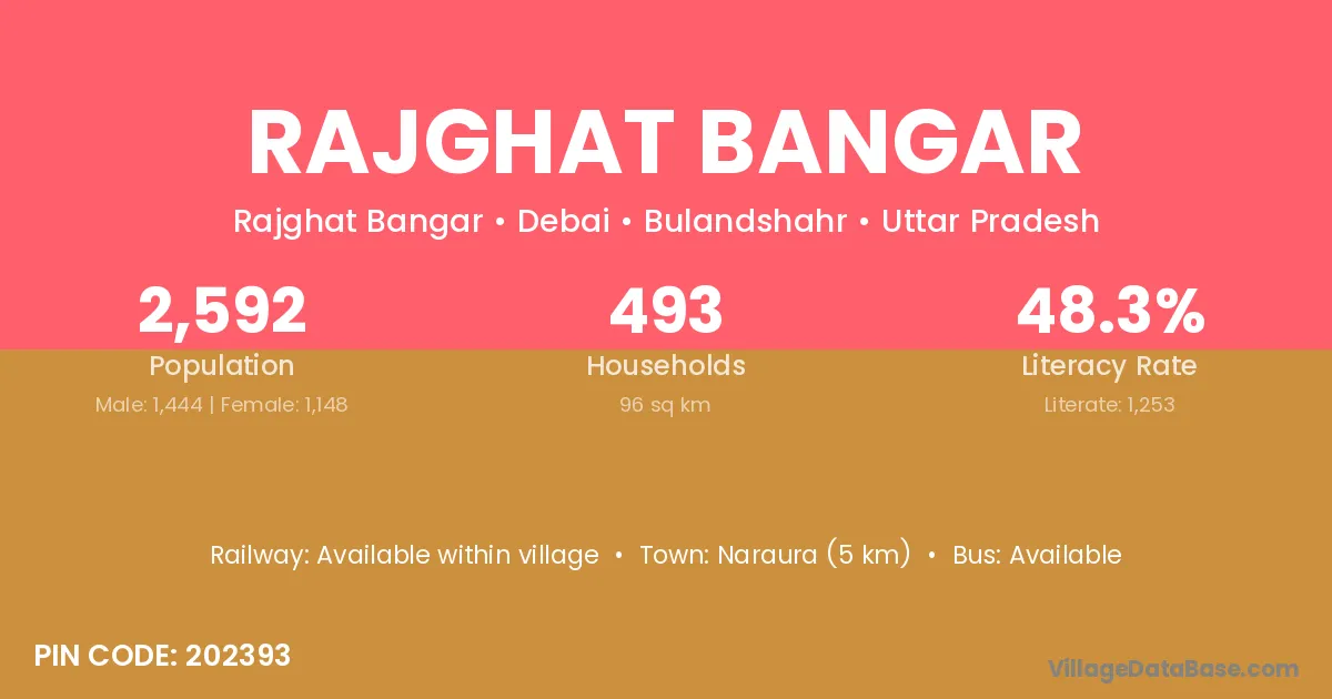 Rajghat Bangar village has a total population of 2,592 people, of which 1,444 are males and 1,148 are females.