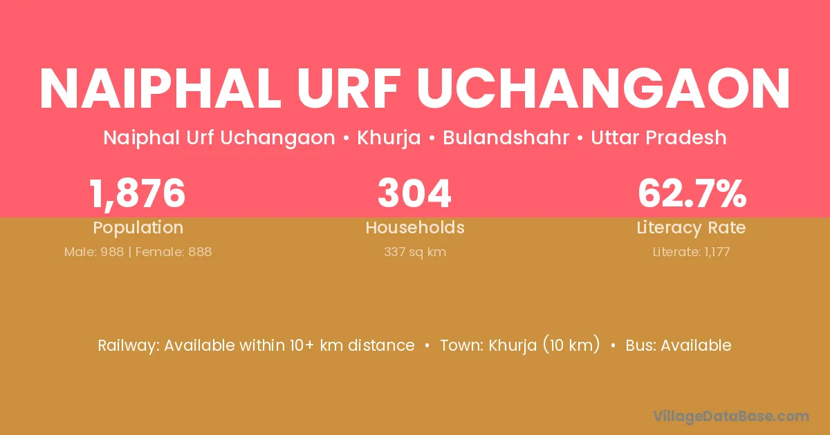 Khurja (10 km) is the nearest town to Naiphal Urf Uchangaon village for major economic activities and is located approximately 10 km away.