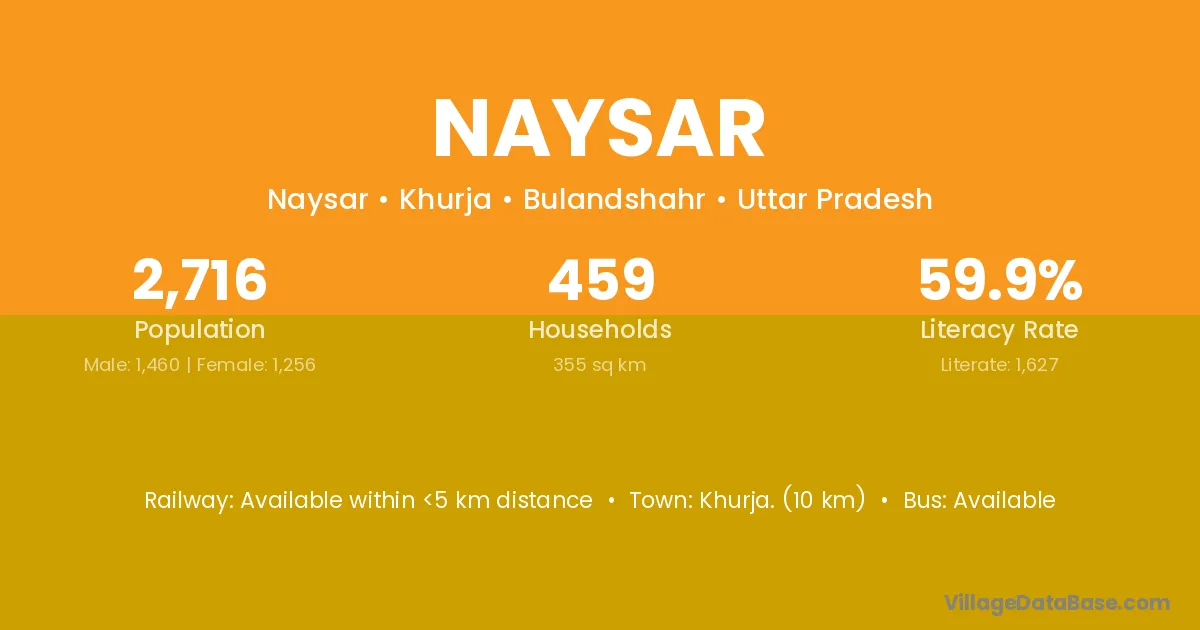 Khurja. (10 km) is the nearest town to Naysar village for major economic activities and is located approximately 10 km away.