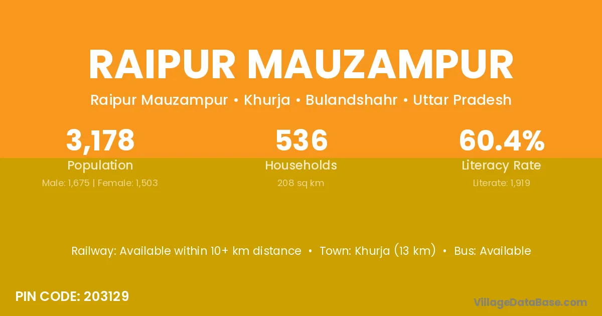 Khurja (13 km) is the nearest town to Raipur Mauzampur village for major economic activities and is located approximately 13 km away.