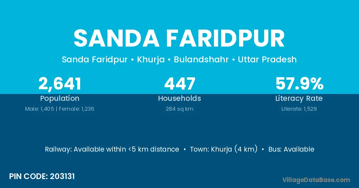 Khurja (4 km) is the nearest town to Sanda Faridpur village for major economic activities and is located approximately 4 km away.