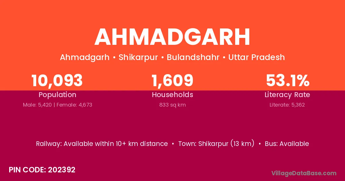 Shikarpur (13 km) is the nearest town to Ahmadgarh village for major economic activities and is located approximately 13 km away.