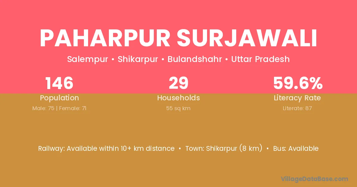 Shikarpur (8 km) is the nearest town to Paharpur Surjawali village for major economic activities and is located approximately 8 km away.