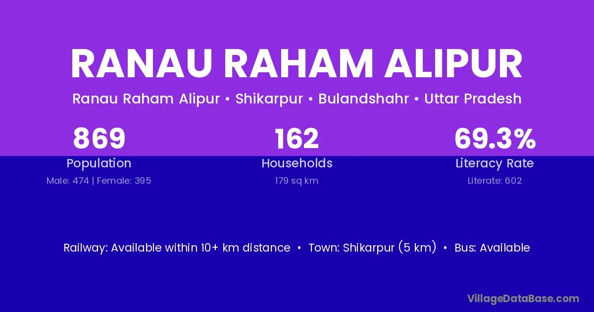 Ranau Raham Alipur village has a total population of 869 people, of which 474 are males and 395 are females.