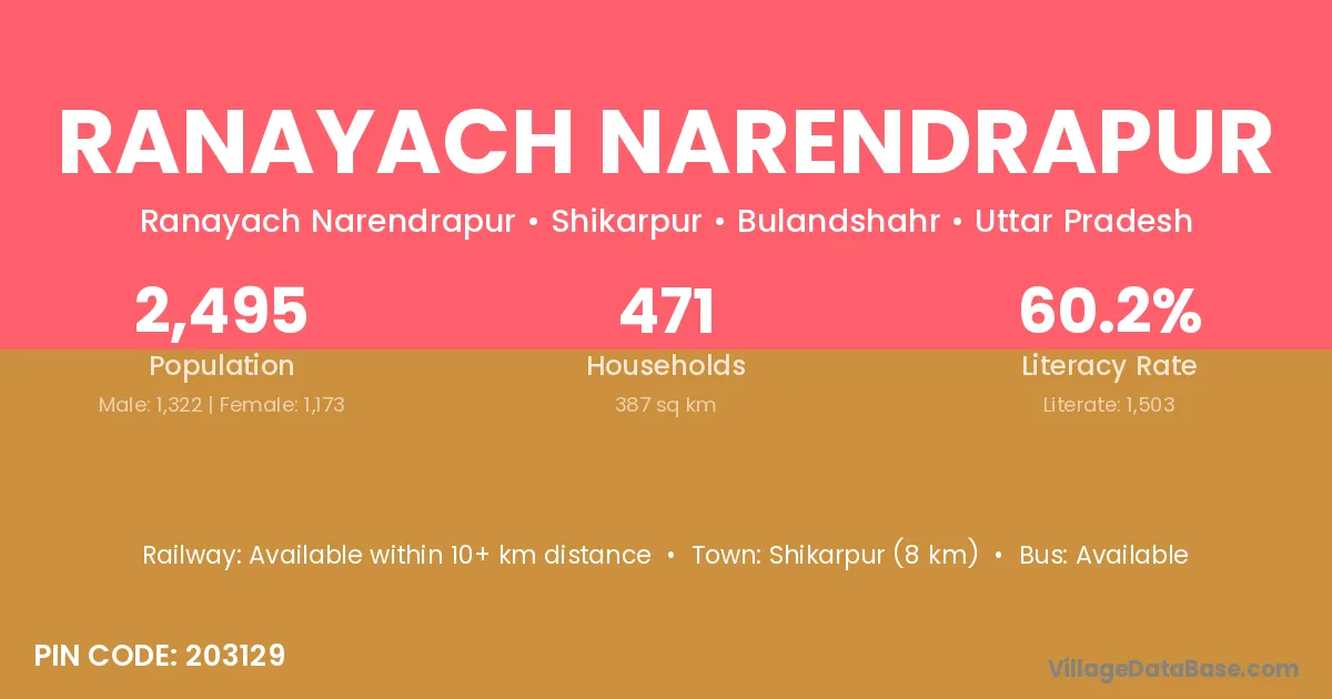 Ranayach Narendrapur village has a total population of 2,495 people, of which 1,322 are males and 1,173 are females.