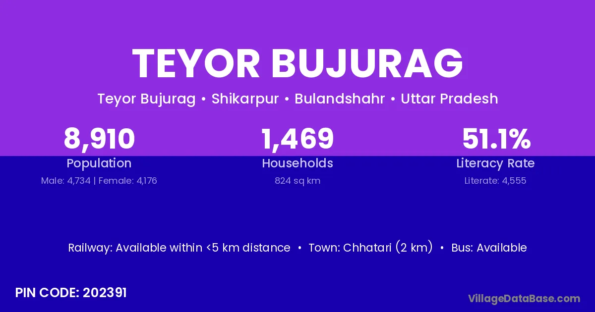 Chhatari (2 km) is the nearest town to Teyor Bujurag village for major economic activities and is located approximately 2 km away.