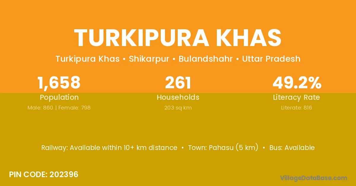 Pahasu (5 km) is the nearest town to Turkipura Khas village for major economic activities and is located approximately 5 km away.