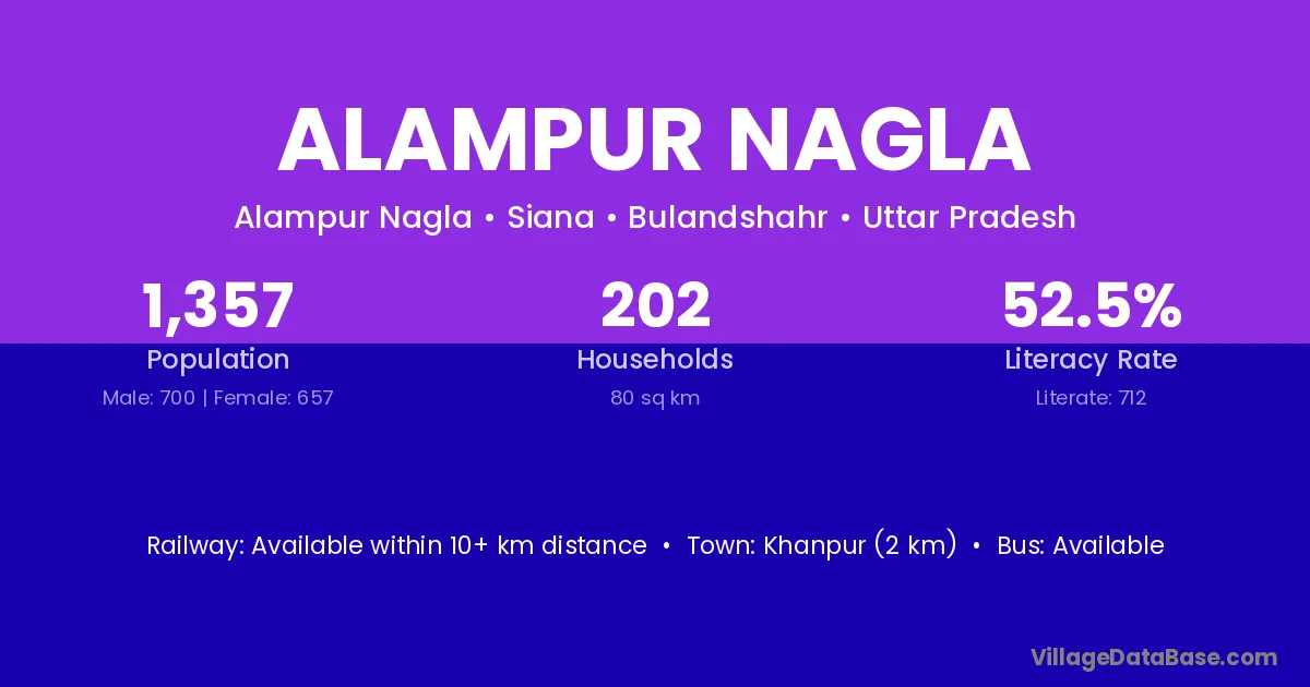 Khanpur (2 km) is the nearest town to Alampur Nagla village for major economic activities and is located approximately 2 km away.