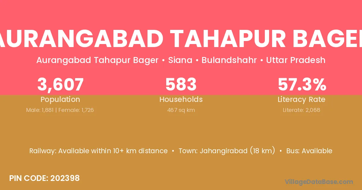 Jahangirabad (18 km) is the nearest town to Aurangabad Tahapur Bager village for major economic activities and is located approximately 18 km away.
