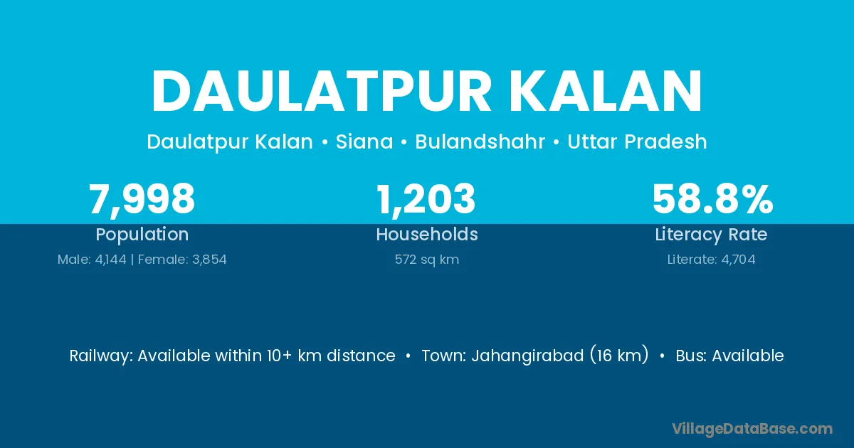 Jahangirabad (16 km) is the nearest town to Daulatpur Kalan village for major economic activities and is located approximately 16 km away.