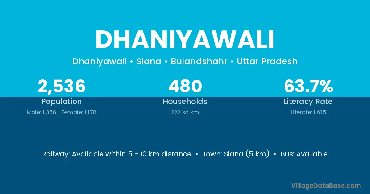 Siana (5 km) is the nearest town to Dhaniyawali village for major economic activities and is located approximately 5 km away.