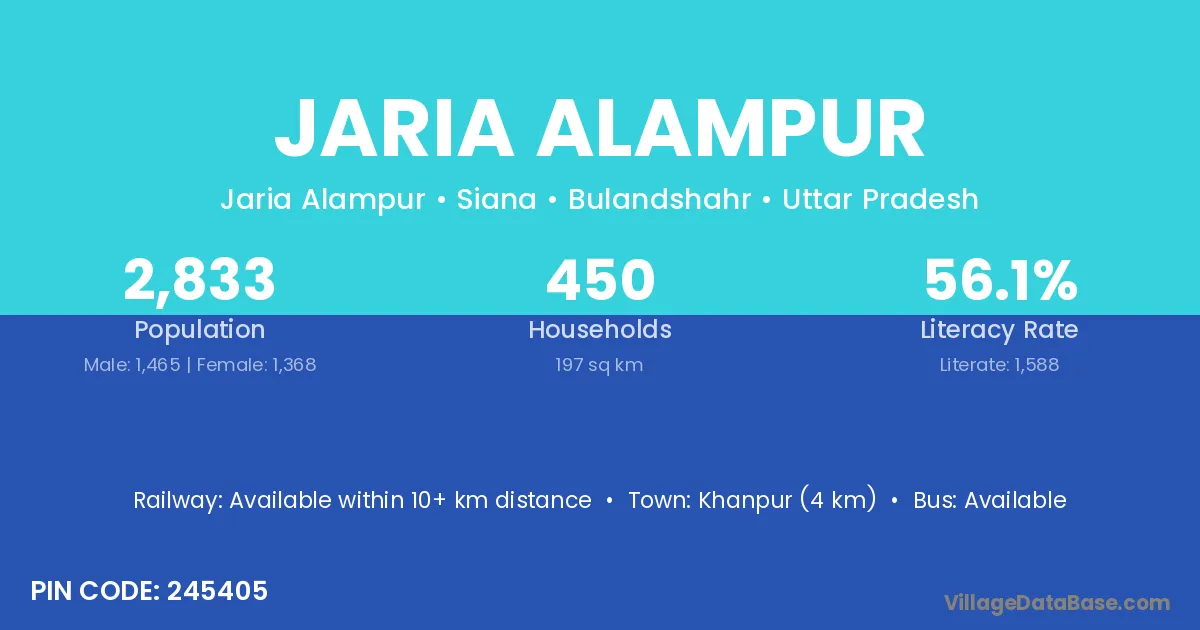 Khanpur (4 km) is the nearest town to Jaria Alampur village for major economic activities and is located approximately 4 km away.