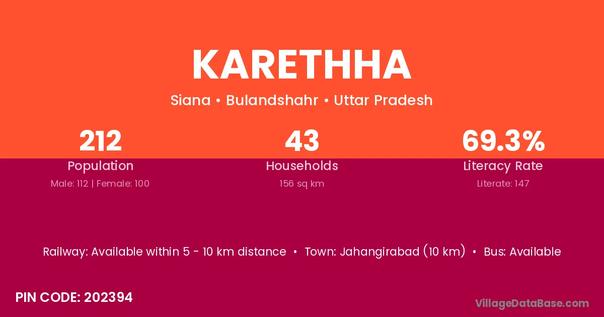 Jahangirabad (10 km) is the nearest town to Karethha village for major economic activities and is located approximately 10 km away.