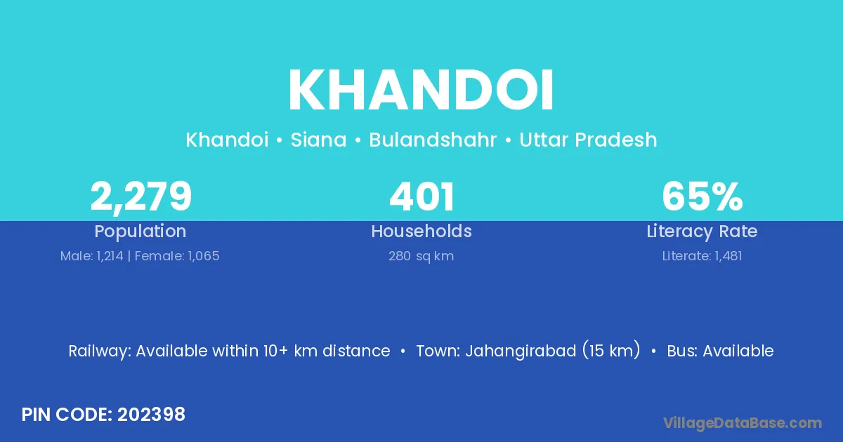 Jahangirabad (15 km) is the nearest town to Khandoi village for major economic activities and is located approximately 15 km away.