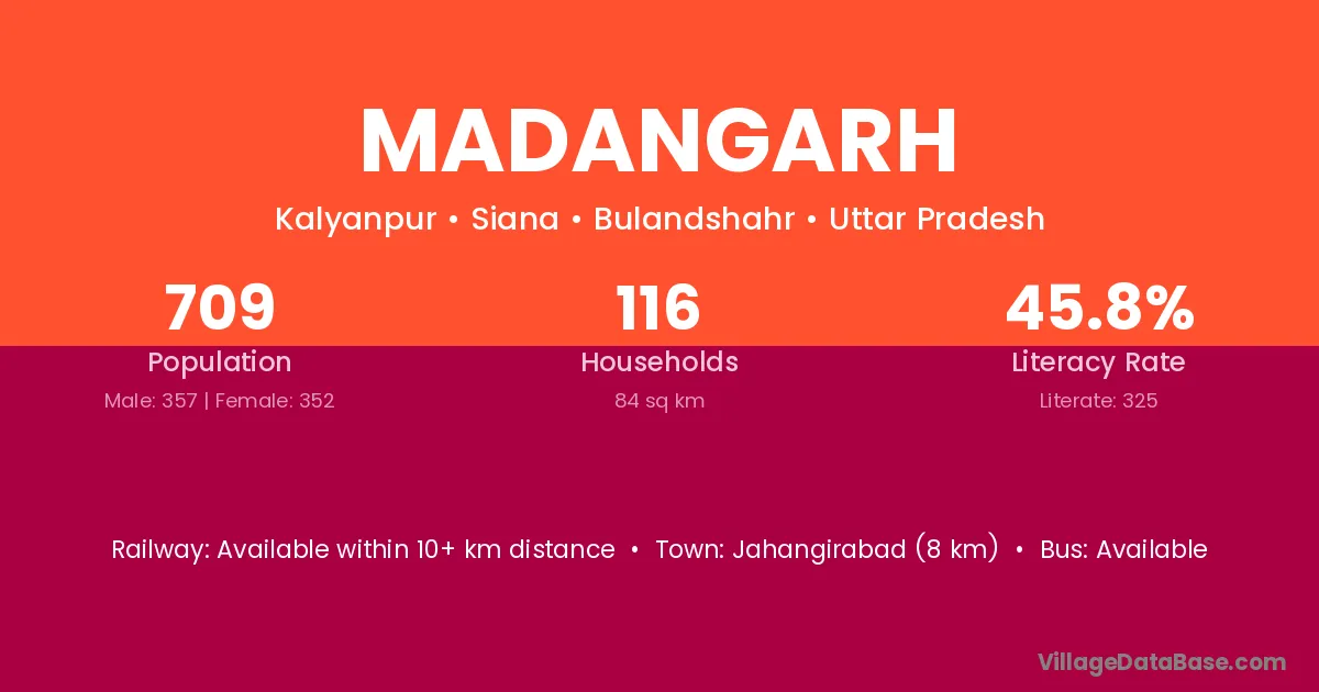 Jahangirabad (8 km) is the nearest town to Madangarh village for major economic activities and is located approximately 8 km away.