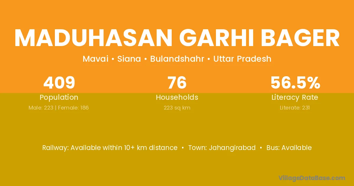 Maduhasan Garhi Bager village has a total population of 409 people, of which 223 are males and 186 are females.
