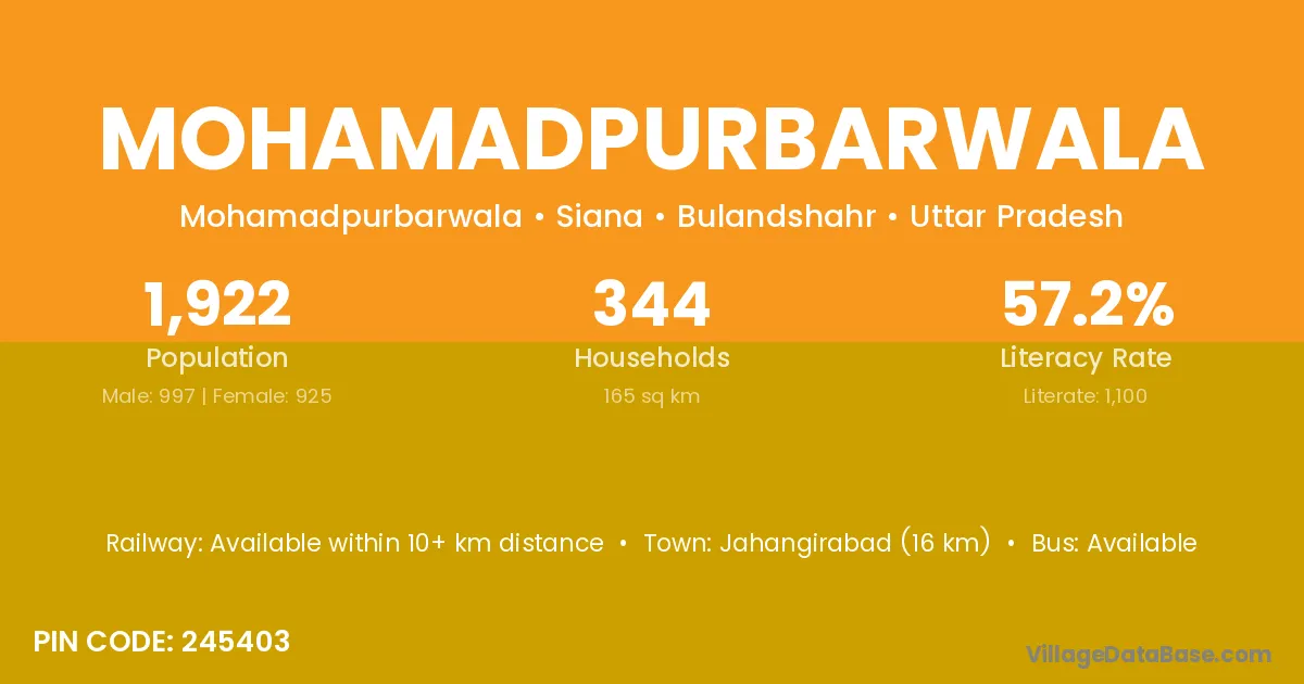 Jahangirabad (16 km) is the nearest town to Mohamadpurbarwala village for major economic activities and is located approximately 16 km away.