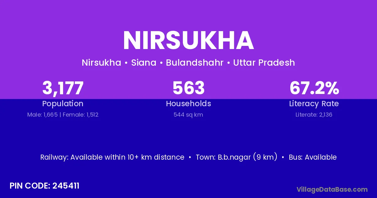 Nirsukha village has a total population of 3,177 people, of which 1,665 are males and 1,512 are females.