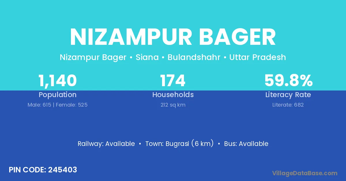 Bugrasi (6 km) is the nearest town to Nizampur Bager village for major economic activities and is located approximately 6 km away.