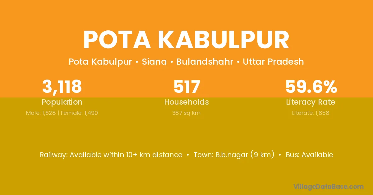 Pota Kabulpur village has a total population of 3,118 people, of which 1,628 are males and 1,490 are females.