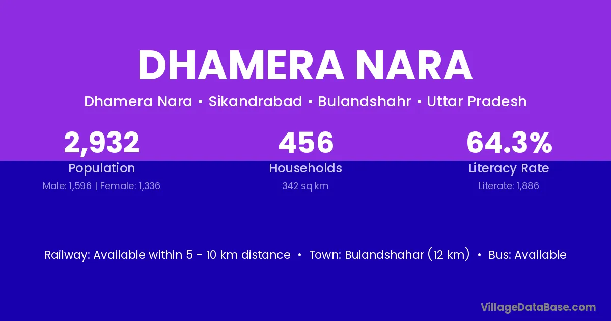 Bulandshahar (12 km) is the nearest town to Dhamera Nara village for major economic activities and is located approximately 12 km away.
