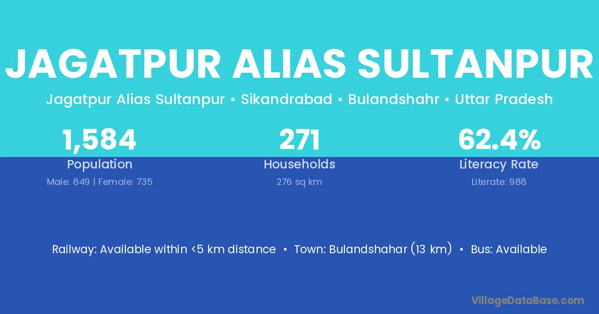 Jagatpur Alias Sultanpur village has a total population of 1,584 people, of which 849 are males and 735 are females.
