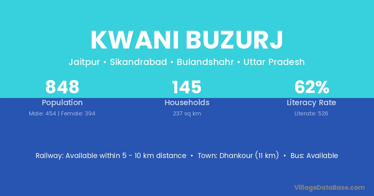 Dhankour (11 km) is the nearest town to Kwani Buzurj village for major economic activities and is located approximately 11 km away.