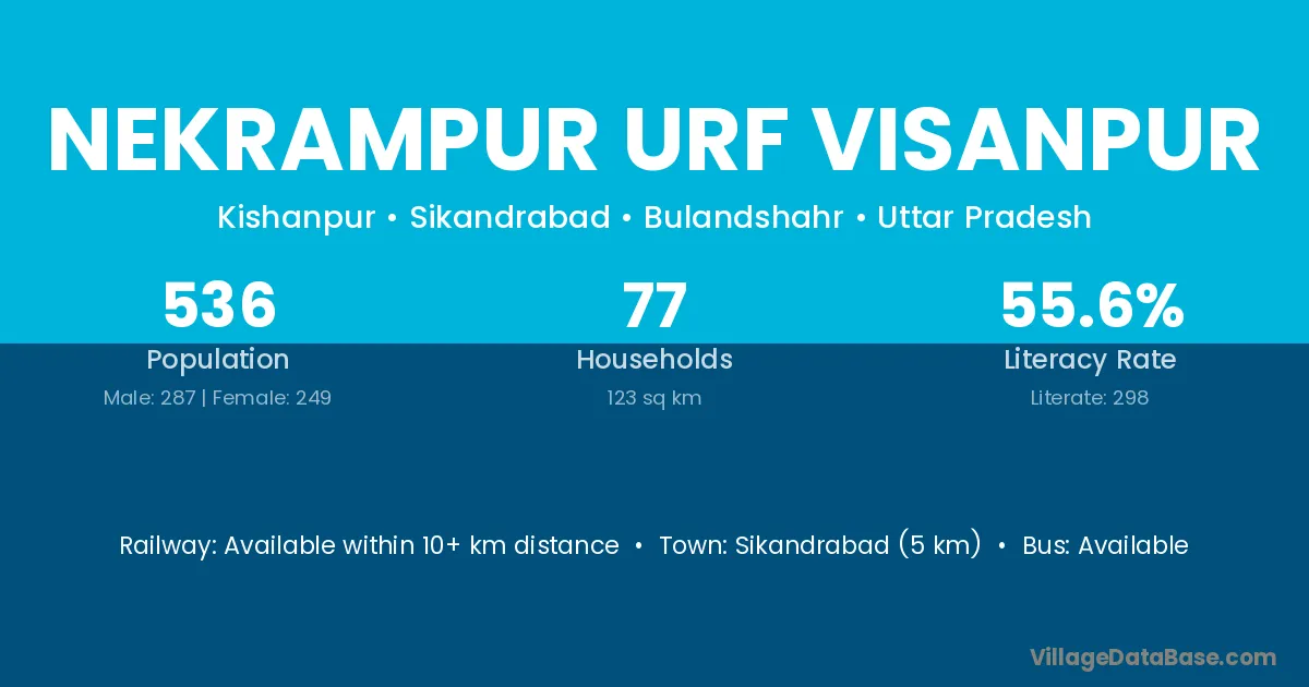 Sikandrabad (5 km) is the nearest town to Nekrampur Urf Visanpur village for major economic activities and is located approximately 5 km away.