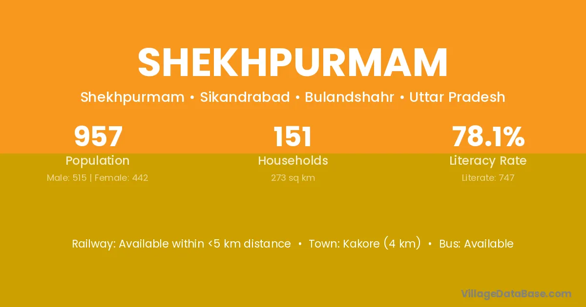 Shekhpurmam village has a total population of 957 people, of which 515 are males and 442 are females.