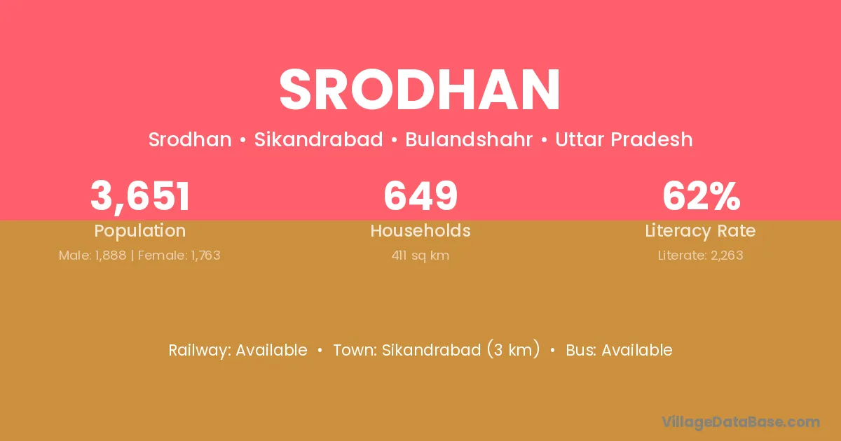 Sikandrabad (3 km) is the nearest town to Srodhan village for major economic activities and is located approximately 3 km away.