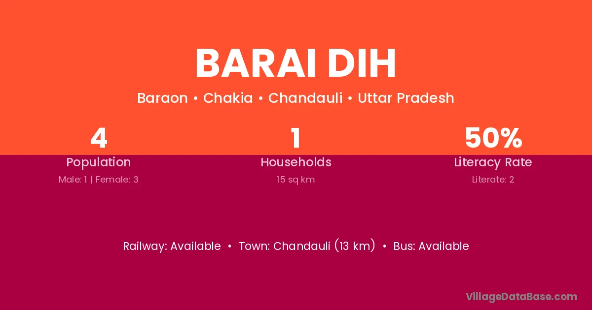 Chandauli (13 km) is the nearest town to Barai Dih village for major economic activities and is located approximately 13 km away.