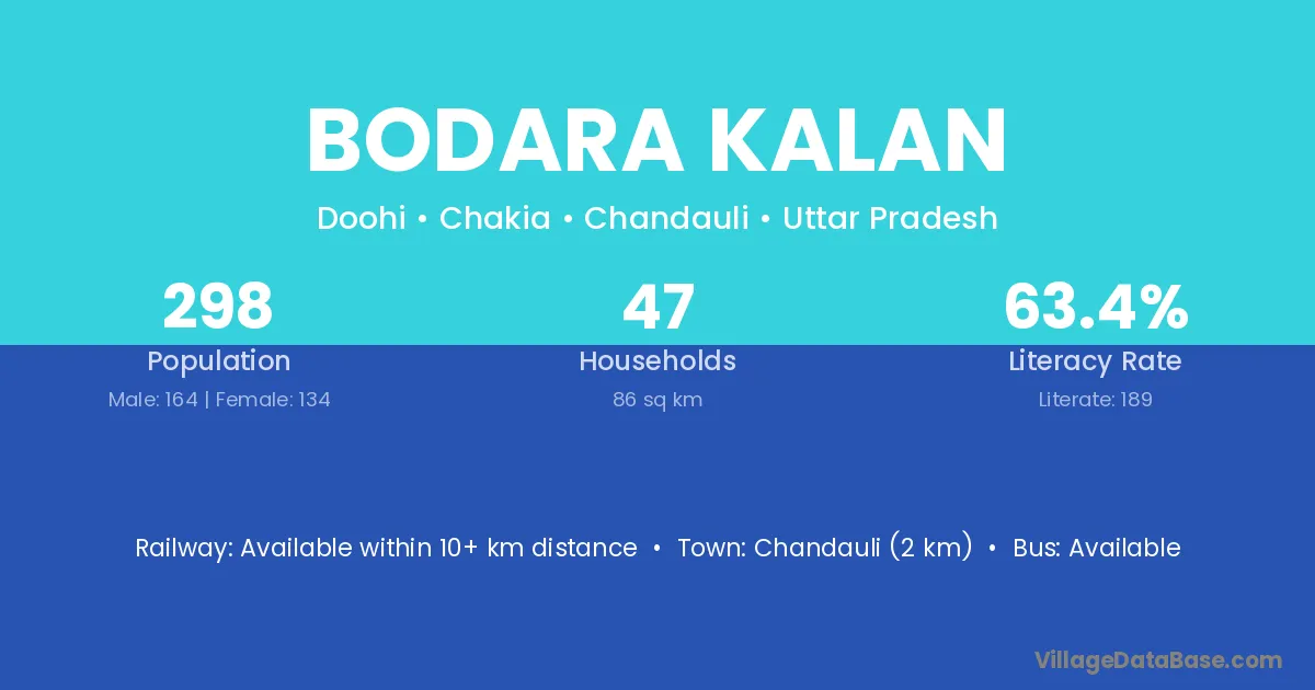 Chandauli (2 km) is the nearest town to Bodara Kalan village for major economic activities and is located approximately 2 km away.