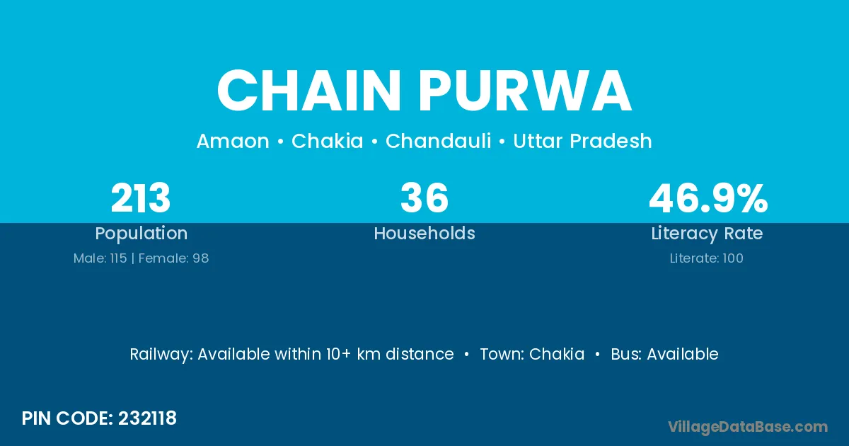 Chain Purwa village has a total population of 213 people, of which 115 are males and 98 are females.