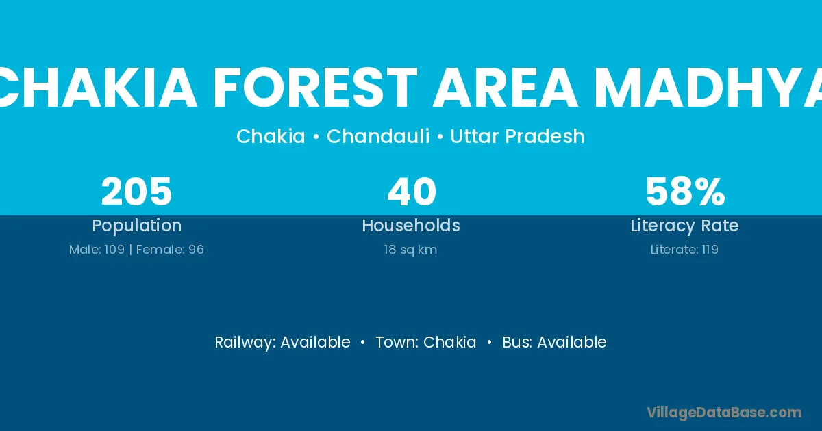 Chakia Forest Area Madhya village has a total population of 205 people, of which 109 are males and 96 are females.