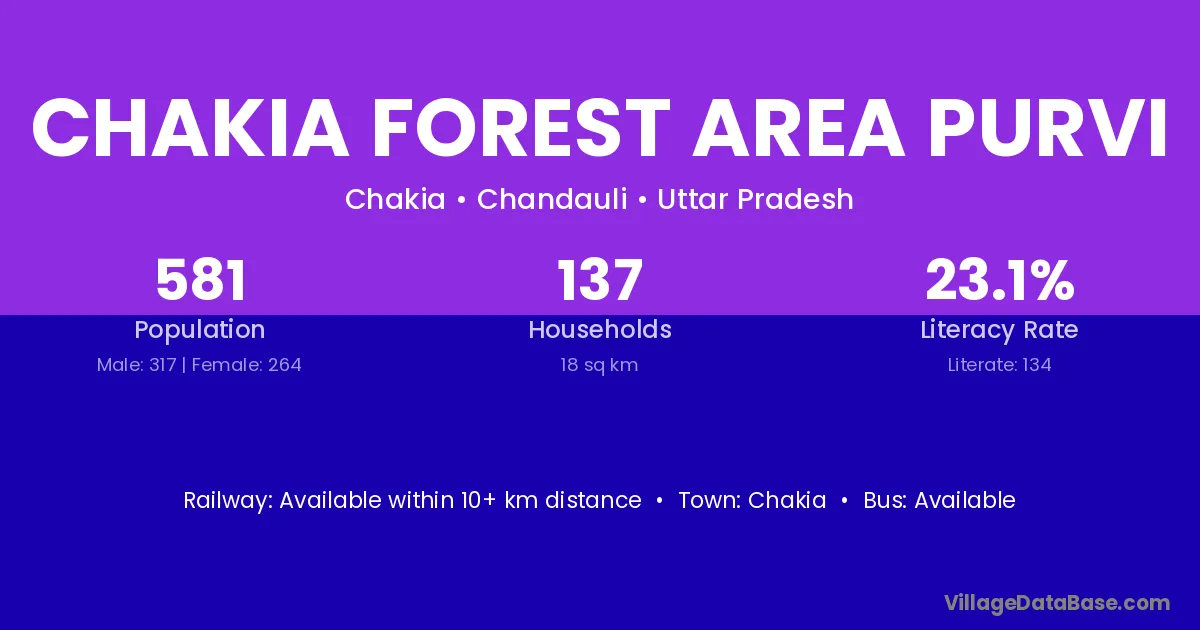 Chakia Forest Area Purvi village has a total population of 581 people, of which 317 are males and 264 are females.