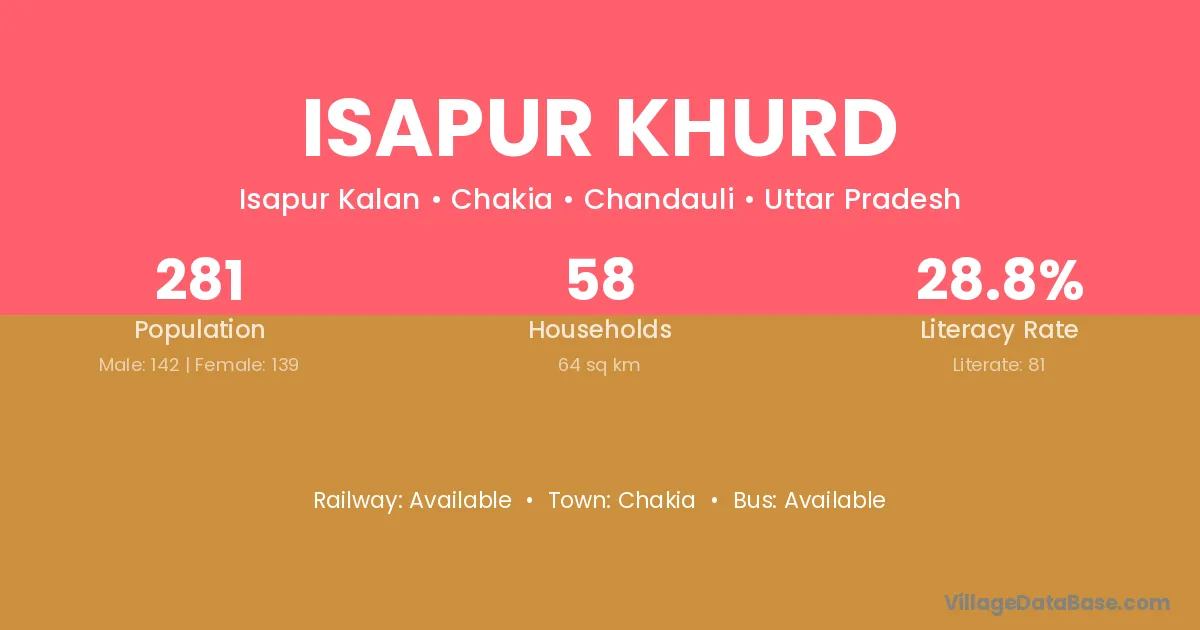 Isapur Khurd village has a total population of 281 people, of which 142 are males and 139 are females.