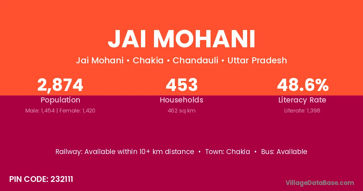 Jai Mohani village has a total population of 2,874 people, of which 1,454 are males and 1,420 are females.