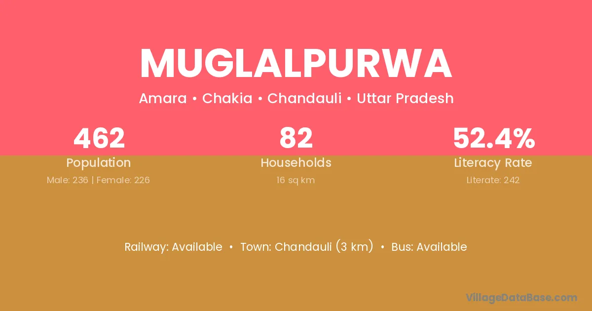 Chandauli (3 km) is the nearest town to Muglalpurwa village for major economic activities and is located approximately 3 km away.