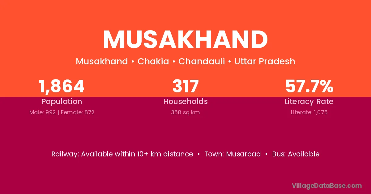 Musakhand village has a total population of 1,864 people, of which 992 are males and 872 are females.