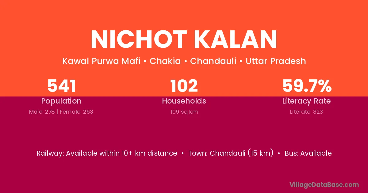 Chandauli (15 km) is the nearest town to Nichot Kalan village for major economic activities and is located approximately 15 km away.