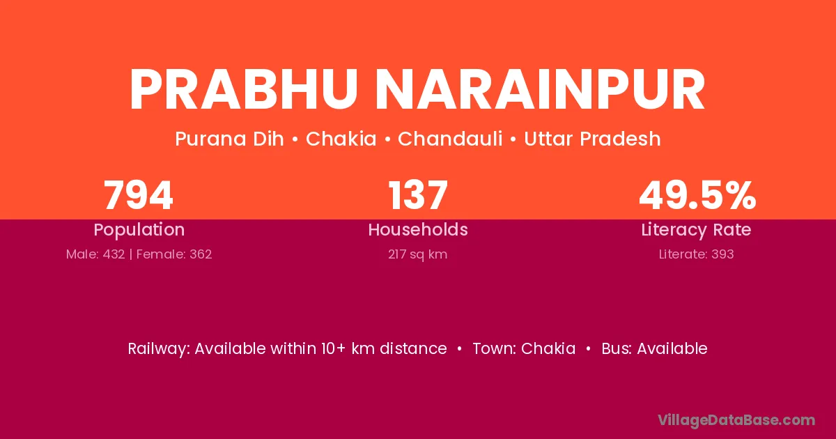 Prabhu Narainpur village has a total population of 794 people, of which 432 are males and 362 are females.