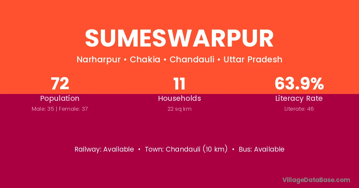 Sumeswarpur village has a total population of 72 people, of which 35 are males and 37 are females.