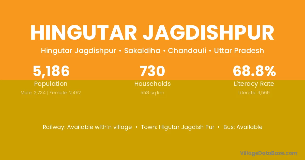 Hingutar Jagdishpur village has a total population of 5,186 people, of which 2,734 are males and 2,452 are females.