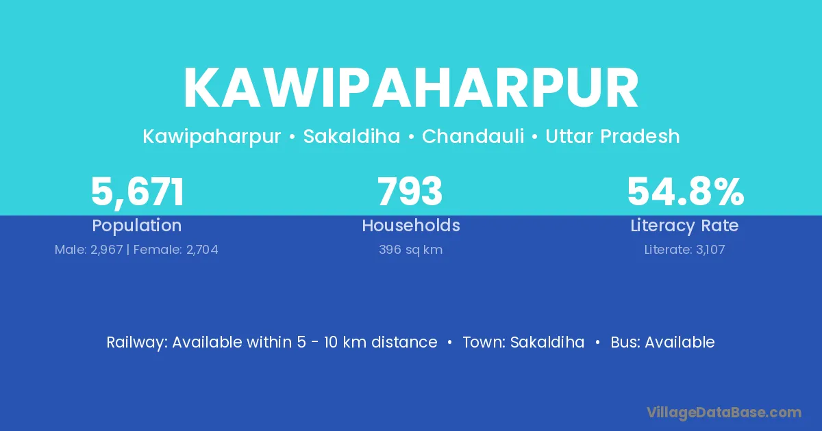 Kawipaharpur village has a total population of 5,671 people, of which 2,967 are males and 2,704 are females.