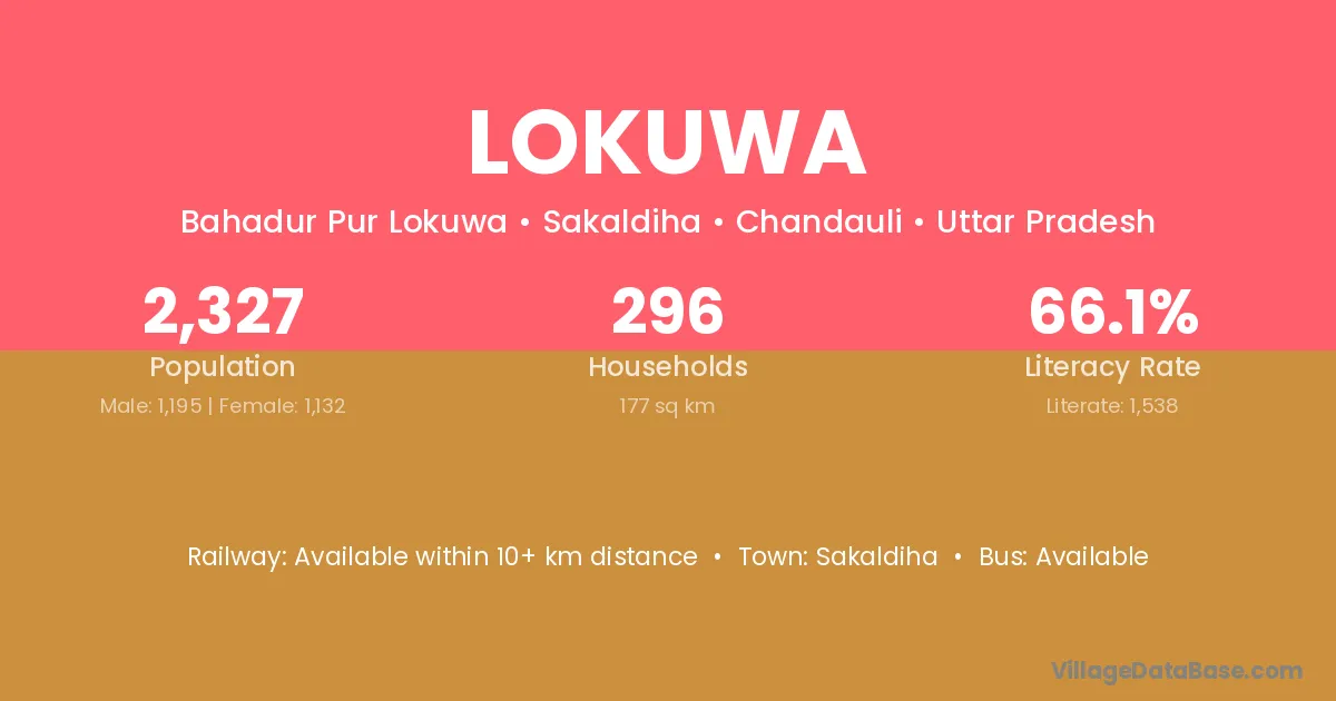 Lokuwa village has a total population of 2,327 people, of which 1,195 are males and 1,132 are females.