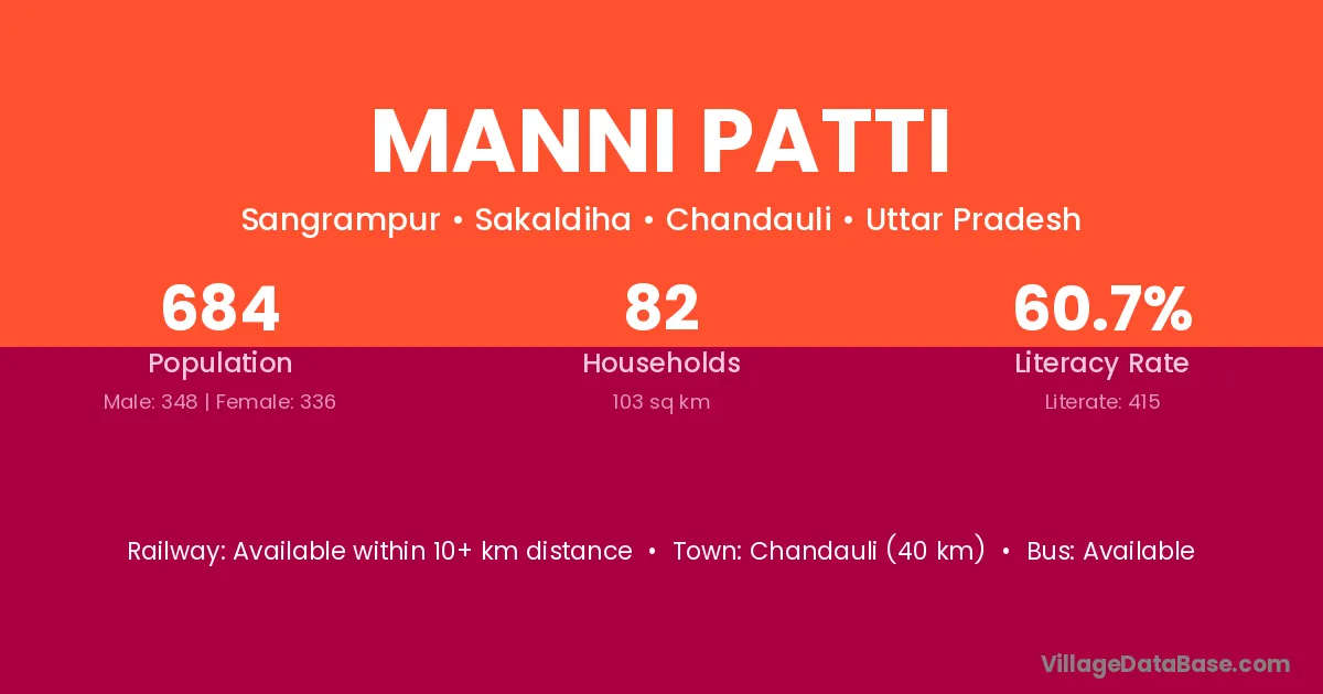 Chandauli (40 km) is the nearest town to Manni Patti village for major economic activities and is located approximately 40 km away.