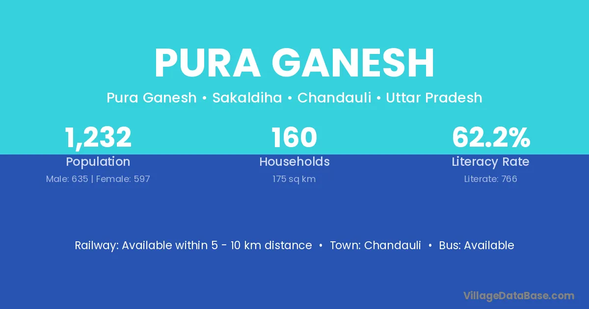 Pura Ganesh village has a total population of 1,232 people, of which 635 are males and 597 are females.