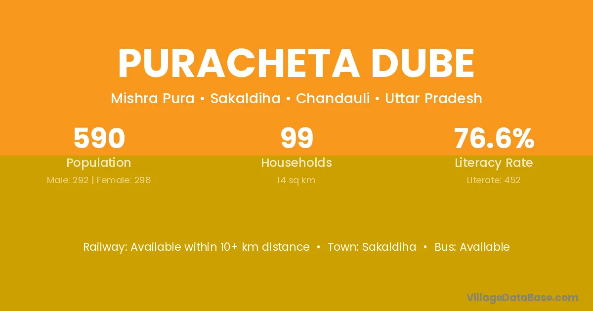 Puracheta Dube village has a total population of 590 people, of which 292 are males and 298 are females.