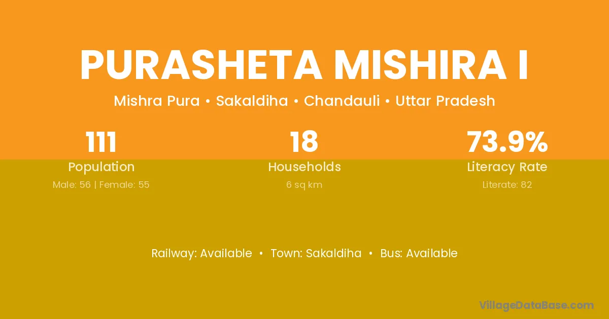 Purasheta Mishira I village is located in the Sakaldiha Tehsil of the Chandauli district in Uttar Pradesh .