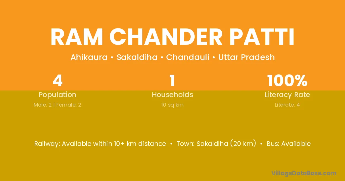 Sakaldiha (20 km) is the nearest town to Ram Chander Patti village for major economic activities and is located approximately 20 km away.